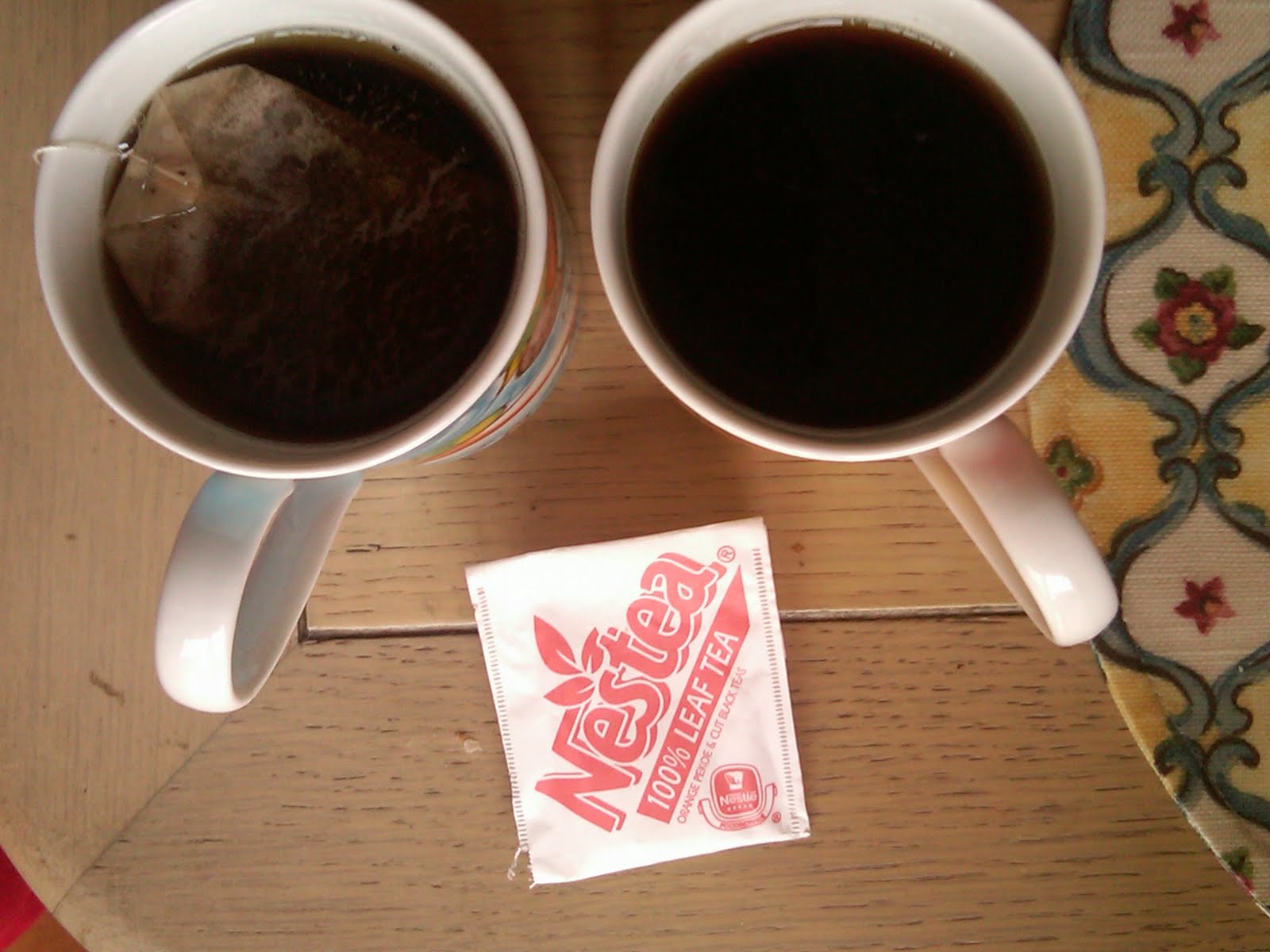DukeOEarl: Today we try the edgier, more ironic (see: hipster) younger brother of Lipton, Nestea. While we don't expect this to be even close to remotely good, we are keeping our minds open. By the way, Tea_Pain and I have a truce right now to keep one of us from walking out of the house with all the tea and the children. Basically, we need marriage counseling. Anyway: tea. We steeped the tea for one minute as it turned dark black. Like the picture below. I was a bit excited. Tea_Pain cried a little.
